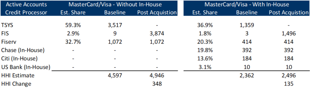 In terms of market structure, we excluded in-house bank issuer processors (e.g., JP Morgan Chase) although we do highlight the impact for credit card processing given it is a highly concentrated market. The merger guidelines allow the inclusion of in-house providers if they could offer their services third party and/or have influence over the supply chain. While Chase and other banks could sell processing third party, the reality is that large banks and others will not process with a bank competitor that has access to their cardholder data, pricing, and other program information. As such, we excluded in-house bank processors but the agencies could certainly include in their analysis.