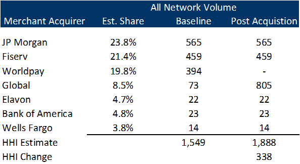 Based on current guidelines, the market is moderately concentrated prior to the Worldpay acquisition, but exceeds the highly concentrated market threshold post Global acquisition. To the extent the agencies use processing (rather than ownership) as the market (which is more difficult to frame as entities or ISOs may have multiple front-ends), we would expect the pre-acquisition HHI to exceed 1,800 and post-acquisition to increase well over 100 points.